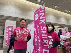 PINK SHIRTSデーをより多くの皆様に知っていただくために、チラシ配布のお手伝いをPINK SHIRTSの仲間の皆様と一緒に行いました。