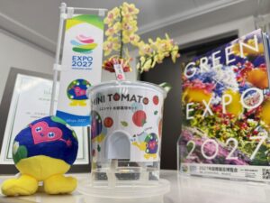 私たちに今できることはより多くの方々にGREEN×EXPO2027の開催をアピールしていくこと!というわけで市役所の2階のHAMARU(MARUZEN ブック&カフェ)でGREEN×EXPO2027のミニのぼり旗と公式マスコットキャラクター トゥンクトゥンクのぬいぐるみ・ミニトマト栽培セットを購入してきました!弊社の事務所入口でお出迎えしています!