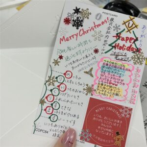 昨年同様、寄せ書き方式でメッセージやイラスト、シールなどを使って感謝の気持ちを込めた素敵なXmasカードが完成しました。
